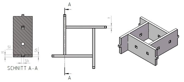 Kategorie | Blechstärke ts/ti (mm) | Breite Stecker Sb (mm) | Höhe Stecker Sh (mm) | Maße Steckloch fest Sf (mm) | Maße Steckloch lose Sl (mm) |